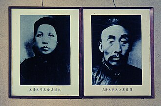 Mao Zedong was born on 26 December 1893, near Shaoshan village in Hunan, during the Qing dynasty.[3] His father, Mao Yichang, was a formerly impoverished peasant who had become one of the wealthiest farmers in Shaoshan. Growing up in rural Hunan, Mao described his father as a stern disciplinarian, who would beat him and his three siblings, the boys Zemin and Zetan, as well as an adopted sister/cousin, Zejian.[4] Mao's mother, Wen Qimei, was a devout Buddhist who tried to temper her husband's strict attitude.[5] Mao too became a Buddhist, but abandoned this faith in his mid-teenage years.[5] At age 8, Mao was sent to Shaoshan Primary School. Learning the value systems of Confucianism, he later admitted that he did not enjoy the classical Chinese texts preaching Confucian morals, instead favouring classic novels like Romance of the Three Kingdoms and Water Margin.[6] At age 13, Mao finished primary education, and his father united him in an arranged marriage to the 17-year-old Luo Yixiu, thereby uniting their land-owning families. Mao refused to recognise her as his wife, becoming a fierce critic of arranged marriage and temporarily moving away. Luo was locally disgraced and died of dysentery in 1910 at 20 years old.[7] Working on his father's farm, Mao read voraciously[8] and developed a "political consciousness" from Zheng Guanying's booklet which lamented the deterioration of Chinese power and argued for the adoption of representative democracy.[9] Mao also read translations of works by Western authors including Adam Smith, Montesquieu, Jean-Jacques Rousseau, Charles Darwin, and Thomas Huxley.[10]: 34 Interested in history, Mao was inspired by the military prowess and nationalistic fervour of George Washington and Napoleon Bonaparte.[11] His political views were shaped by Gelaohui-led protests which erupted following a famine in Changsha, the capital of Hunan; Mao supported the protesters' demands, but the armed forces suppressed the dissenters and executed their leaders.[12] The famine spread to Shaoshan, where starving peasants seized his father's grain. He disapproved of their actions as morally wrong, but claimed sympathy for their situation.[13] At age 16, Mao moved to a higher primary school in nearby Dongshan,[14] where he was bullied for his peasant background.[15]