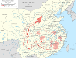When party leader Sun Yat-sen died in May 1925, he was succeeded by Chiang Kai-shek, who moved to marginalise the left-KMT and the CCP.[80] Mao nevertheless supported Chiang's National Revolutionary Army, who embarked on the Northern Expedition attack in 1926 on warlords.[81] In the wake of this expedition, peasants rose up, appropriating the land of the wealthy landowners, who were in many cases killed. Such uprisings angered senior KMT figures, who were themselves landowners, emphasising the growing class and ideological divide within the revolutionary movement.[82]