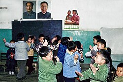 In 1911, Mao began middle school in Changsha.[16] Revolutionary sentiment was strong in the city, where there was widespread animosity towards Emperor Puyi's absolute monarchy and many were advocating republicanism. The republicans' figurehead was Sun Yat-sen, an American-educated Christian who led the Tongmenghui society.[17] In Changsha, Mao was influenced by Sun's newspaper, The People's Independence (Minli bao),[18] and called for Sun to become president in a school essay.[19] As a symbol of rebellion against the Manchu monarch, Mao and a friend cut off their queue pigtails, a sign of subservience to the emperor.[20]